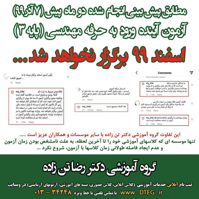 بنابراين با توجه به خبر برگزاري آزمون در اسفند 99 و تحليل بيان شده، تنها زمان باقيمانده جهت برگزاري آزمون 🔸 روزهاي پنجشنبه 30 بهمن و جمعه 1 اسفند 99 🔸 مي باشد. اما اگر هدف برگزاري در اين تاريخ باشد، بازه زماني 3 ماهه بيان شده طبق خبر دفتر مقررات ملي، از زمان اخذ مجوز ستاد کرونا، وجود نخواهد داشت. نکته حائز اهميت ديگر تشديد بيماري کرونا در روزهاي اخير و تعويق آزمونهاي کشوري ديگر (آزمون استخدامي، آزمون وکالت، آزمونهاي زبان هاي بين المللي و … ) مي باشد. بنابراين با توجه به موارد بيان شده احتمال برگزاري آزمون آينده در سال 1399 ضعيف مي باشد.