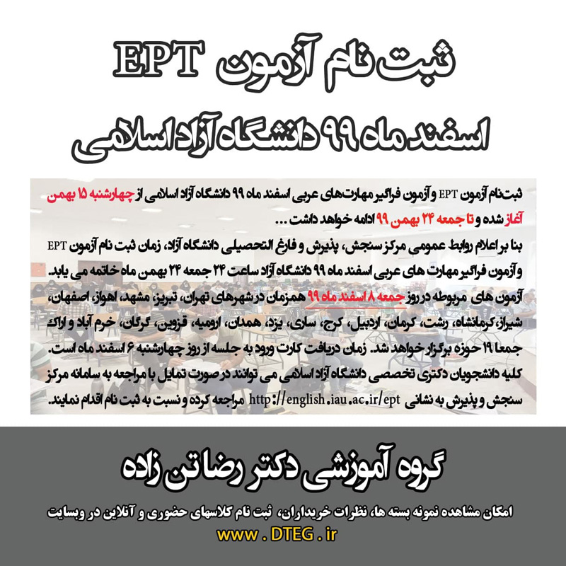 ثبتنام آزمون EPT اسفند ماه 99 دانشگاه آزاد اسلامی تا جمعه 24 بهمن 99 ادامه خواهد داشت … 20 بهمن 1399 ارسال شده توسط مدیریت سایر آزمونها و موارد ثبتنام آزمون EPT و آزمون فراگیر مهارتهای عربی اسفند ماه 99 دانشگاه آزاد اسلامی تا جمعه 24 بهمن 99 ادامه خواهد داشت … 👈🏻 زمان ثبت نام: 24 بهمن 99 👈🏻 زمان آزمون: 8 اسفند 99 برچسب ها: ثبت نامآزمون زبانآزمون eptEPTدانشگاه آزادآزمون زبان دکترا
