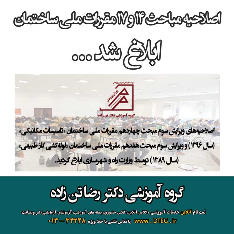 ابلاغ اصلاحیه مباحث 14 و 17 مقررات ملی ساختمان ایران توسط وزارت راه و شهرسازی 26 بهمن 1399 ارسال شده توسط مدیریت گروه آموزشی دکتر تن زاده، آزمون پایه 3 نظام مهندسی، عمران، معماری، برق، مکانیک، همه رشته ها دريافت متن اصلاحیه مباحث 14 و 17 مقررات ملی ساختمان برچسب ها: اصلاحیهمبحث 14مبحث 17لوله کشی گاز طبیعیتاسیسات مکانیکیابلاغ اصلاحیهمقررات ملي ساختمانمقررات ملي