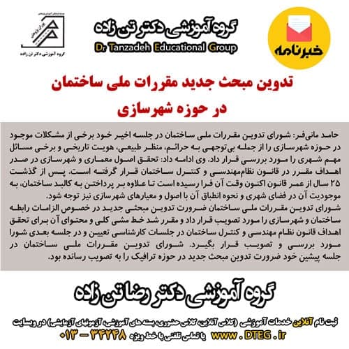 تدوین مبحث جدید مقررات ملی ساختمان در حوزه شهرسازی 26 اسفند 1399 ارسال شده توسط مدیریت گروه آموزشی دکتر تن زاده، آزمون پایه 3 نظام مهندسی، عمران، معماری، برق، مکانیک، همه رشته ها تدوین مبحث جدید مقررات ملی ساختمان در حوزه شهرسازی برچسب ها: لوله کشی گاز طبیعیتاسیسات مکانیکیابلاغ اصلاحیهآزمونآزمون نظام مهندسیثبت نام آزمونمقررات ملي ساختمانمقررات مليثبت ناماصلاحیه