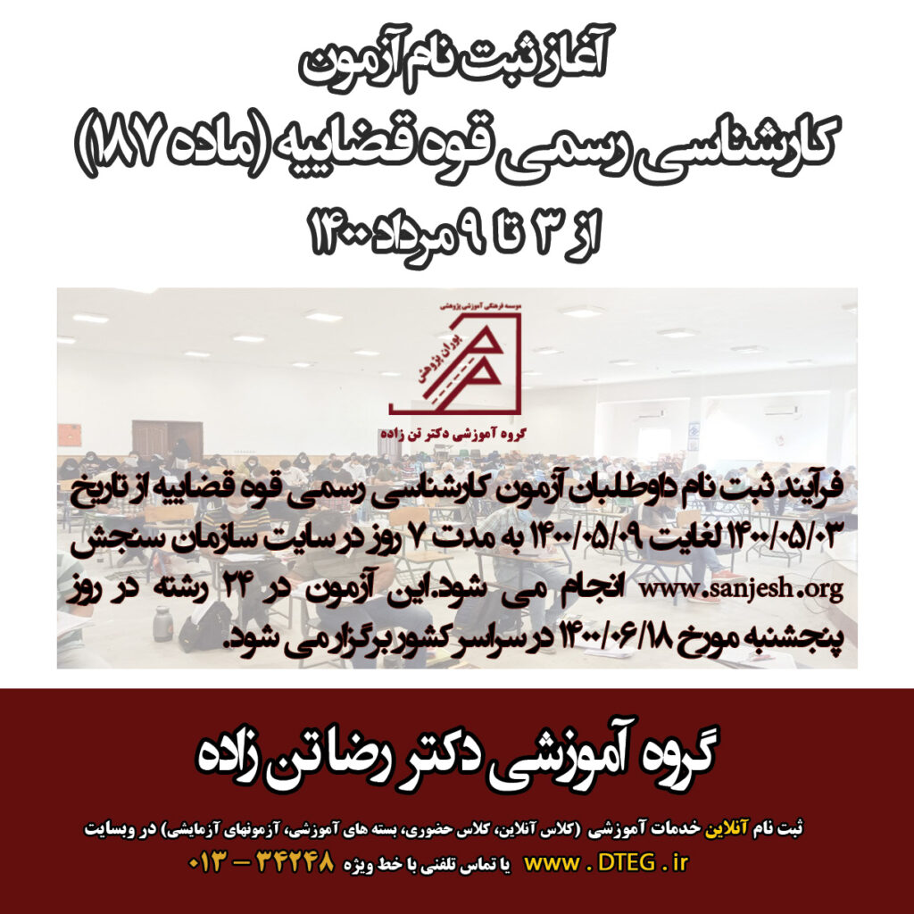 فرآيند ثبت نام داوطلبان آزمون كارشناسی رسمی قوه قضاییه از تاريخ 1400/05/03 لغايت 1400/05/09 به مدت 7 روز در سایت سازمان سنجش www.sanjesh.org انجام می شود.این آزمون در 24 رشته در روز پنجشنبه مورخ 1400/06/18 در سراسر کشور برگزار می شود.