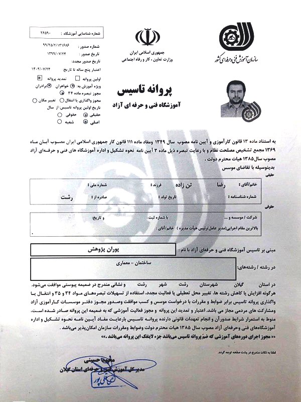 طی سالهای 1390 تا 1397، نماینده رسمی موسسه آموزش عالی آزاد چتر دانش در استان گیلان بوده که در زمینه آزمونهای هماهنگ کشوری و بسته های آموزشی کارشناسی ارشد حقوق، وکالت و آزمون مشاوران حقوقی فعالیت می کرد. در سال 1390، مجوز تاسیس دفتر فنی و مهندسی طراحی با نام پوران پژوهش را نیز دریافت نمود و در زمینه برگزاری دوره های آموزشی کارمندان دولت، دارای تفاهم نامه و قراردادهای آموزشی و همکاری مشترک با اداره کل راه و شهرسازی استان کیلان، سازمان منظقه آزاد انزلی، اداره کل بنیاد مسکن انقلاب اسلامی، سازمان نظام کاردانی استان گیلان، شرکت عمران و مسکن سازان استان گیلان، شرکت مادر تخصصی عمران و بهسازی شهری ایران، مرکز کنترل گاز استان گیلان، مراکز دانشگاهی مختلف و … می باشد و در زمینه های مختلف موفق به اخذ مجوزهای لازم از مراجع ذیصلاح شده است.