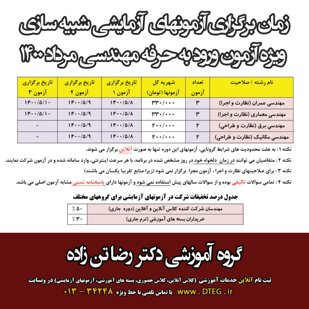 آزمونهاي آزمايشي شبيه سازي شده آزمون پایه 3 نظام مهندسی با بيشترين جامعه آماري در کشور به صورت حضوري و آنلاين در رشته های عمران (نظارت و اجرا و محاسبات)، مکانیک (نظارت و طراحي)، برق (نظارت و طراحي) و معماری (نظارت و اجرا) با سوالات کاملا تاليفي و استاندارد طرح شده توسط کادر علمي مجموعه به سرپرستي آقاي دکتر تن زاده، برگزار مي شود. امکان شرکت حضوري و مجازي(آنلاين) براي همه مهندسان عزيز از نقاط مختلف کشور وجود دارد....
