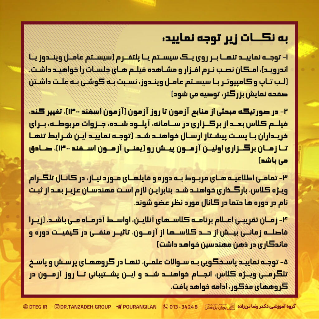 کلاسهاي آنلاین ويژه آمادگي آزمون پایه 3 ورود به حرفه مهندسی به درخواست مهندسين عزيز از نقاط مختلف کشور و با بالاترين کيفيت در حال ثبت نام و برگزاری مي باشد. امکان مشاهده بازپخش فيلم کلاسها به دفعات با موبایل و کامپیوتر با سیستم عامل ویندوز یا اندروید (امکان فعال سازی تنها در یک سیستم) تا روز آزمون، و دريافت کل پک آموزشي بصورت رايگان براي حاضرين دوره، از جمله خدمات اين کلاسها مي باشد که رضايت بالاي 96 درصدي حاضرين دوره ها را به همراه داشته است ...