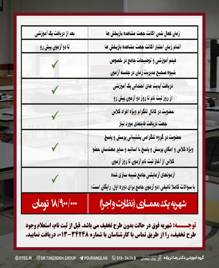 ?- دریافت آپدیت های احتمالی منابع تا روز آزمون (در صورتیکه مبحثی از منابع آزمون تا دو آزمون پیش رو، نسبت به منابع حال حاضر قسمت مواد و منابع آزمون سایت مقررات ملی ساختمان، تغییر کند، فیلم کلاس بعد از برگزاری، بصورت رایگان در سامانه، آپلود خواهد شد. (توجه نمایید این شرایط تنها تا زمان برگزاری دو آزمون پیش رو، صادق می باشد)