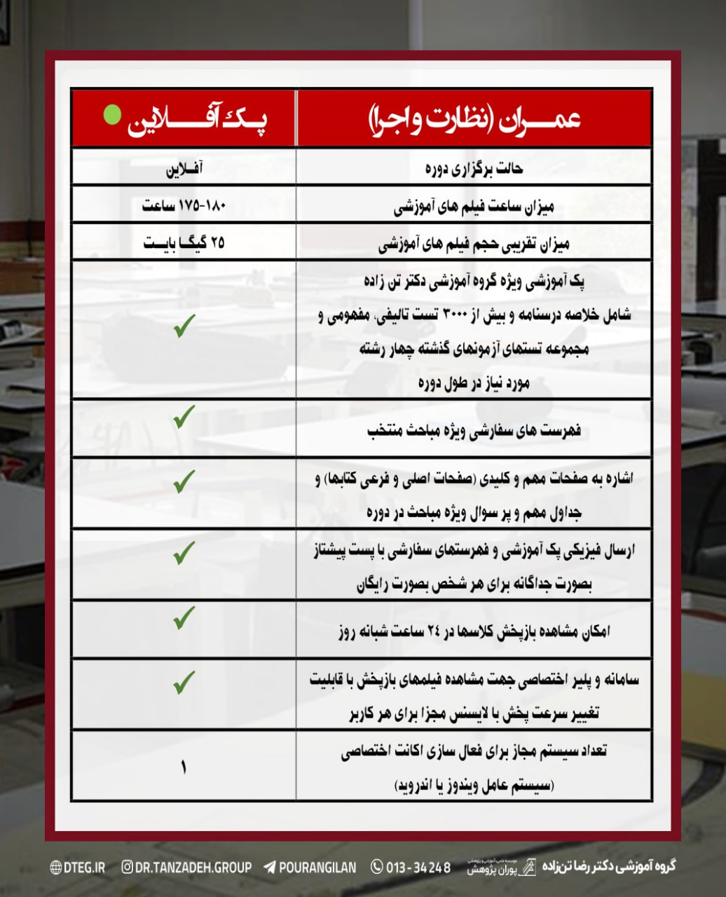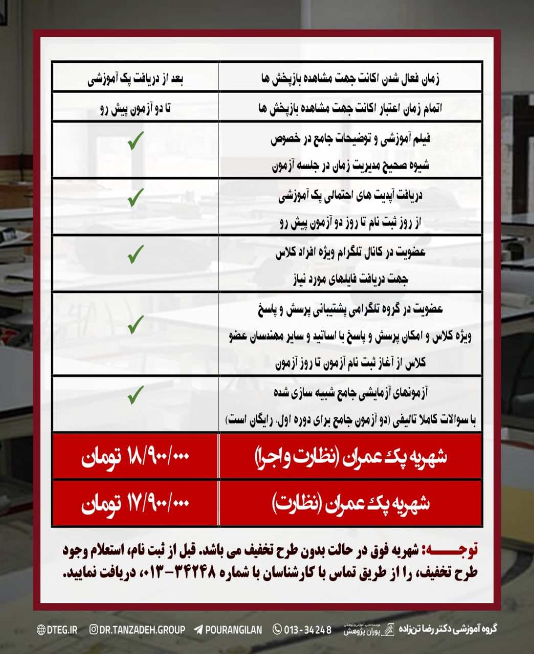 📗– دریافت آپدیت های احتمالی منابع تا روز آزمون (در صورتیکه مبحثی از منابع آزمون تا دو آزمون پیش رو، نسبت به منابع حال حاضر قسمت مواد و منابع آزمون سایت مقررات ملی ساختمان، تغییر کند، فیلم کلاس بعد از برگزاری، بصورت رایگان در سامانه، آپلود خواهد شد.