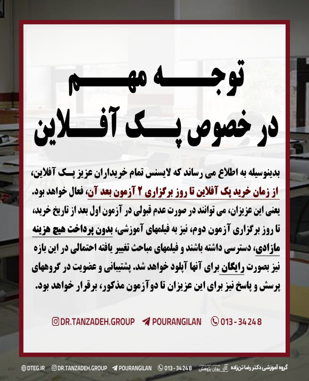 📗– تشکيل گروههاي پشتيباني در تلگرام براي هر کلاس و امکان پرسش و پاسخ با اساتید تا روز برگزاري آزمون در گروههاي پشتيباني تلگرامي